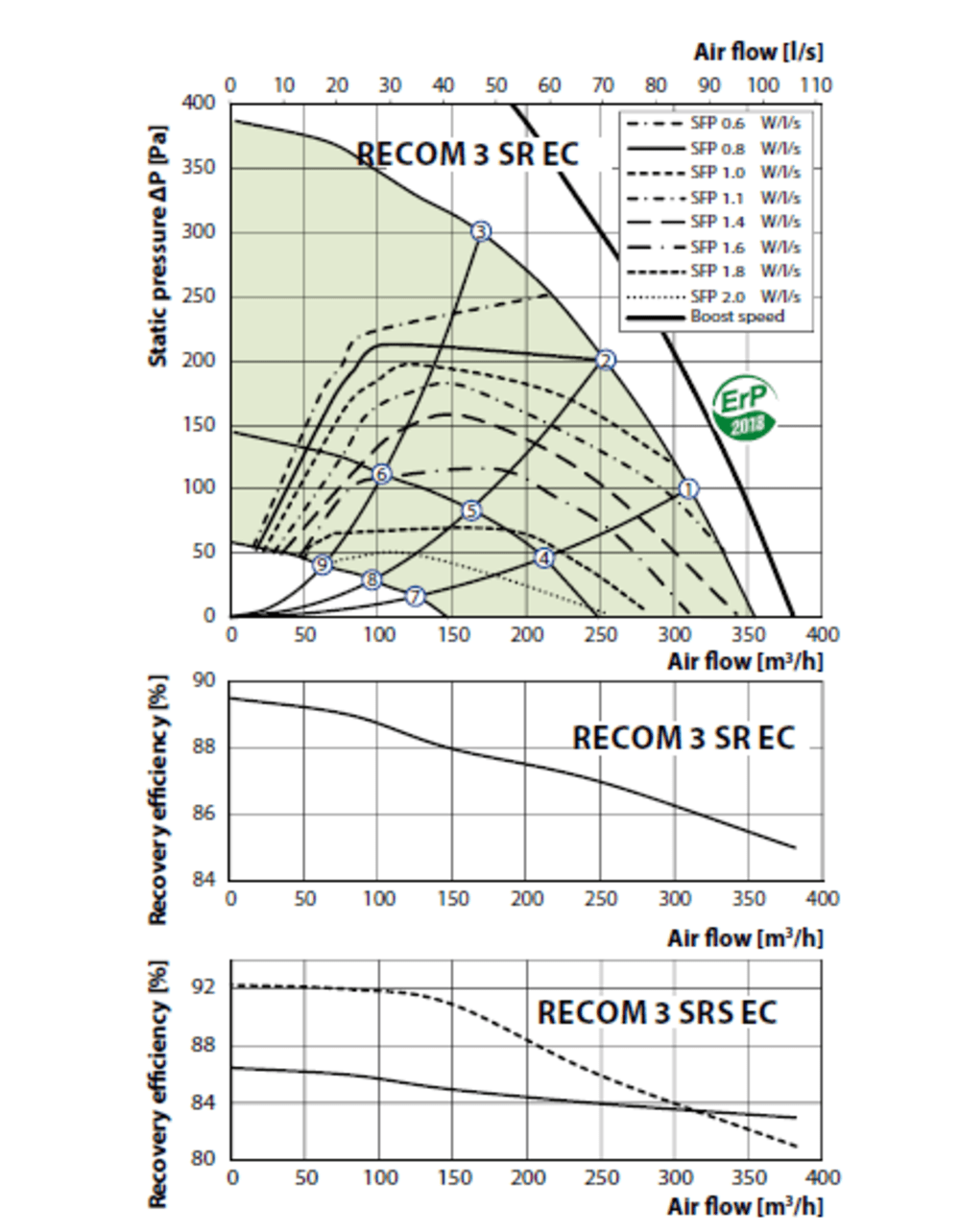 - Ypač žemos SFP (savitoji ventilaitorių galia) reikšmės – indikuoja, kiek elektros energijos sunaudoja ventiliatoriai, lyginant su pakeičiamo oro tūriu.